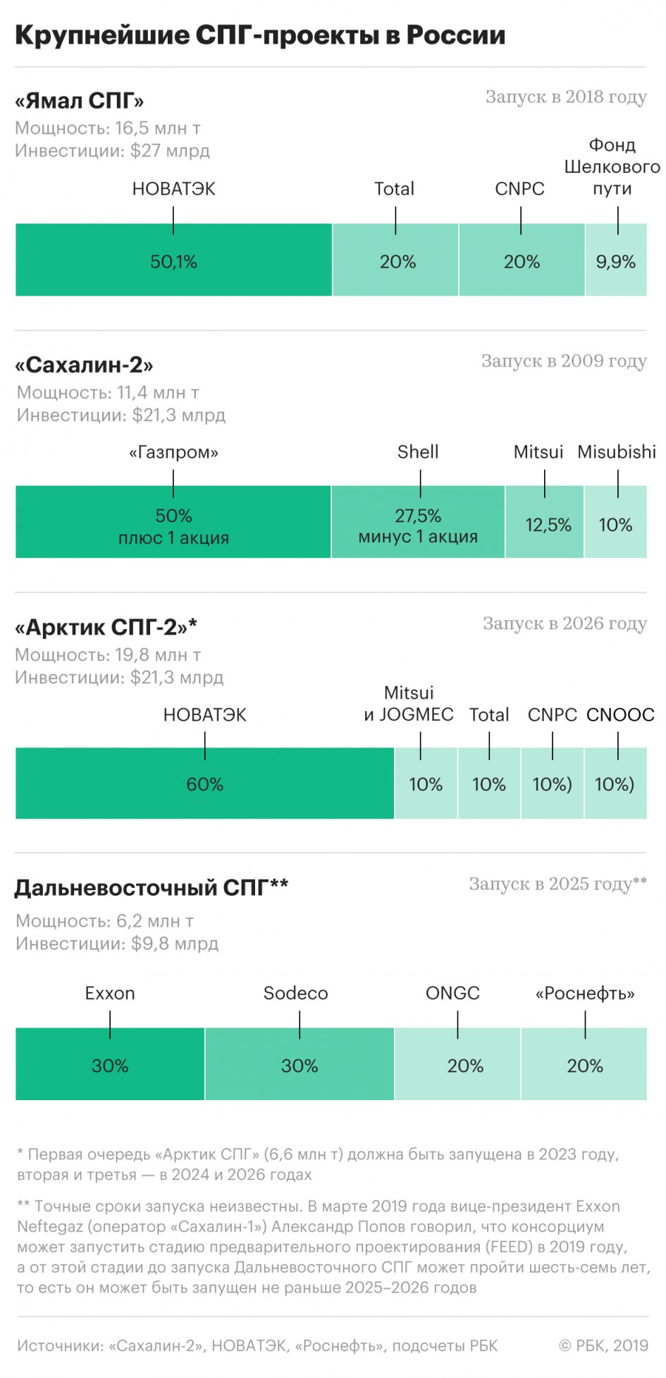 В сентябре НОВАТЭК принял инвестиционное решение о строительстве второго СПГ-завода «Арктик СПГ-2» мощностью 19,8 млн т в год. Первая очередь (6,6 млн т в год) должна быть запущена в 2023 году, вторая и третья — в 2024 и 2026 годах. Тогда же глава «Роснефти» Игорь Сечин заявил, что «Роснефть» вместе с партнерами по проекту «Сахалин-1» (сейчас не производит СПГ) намерена построить завод «Дальневосточный СПГ» в Де-Кастри в Хабаровском крае мощностью 6,2 млн т. Запуск этого завода запланирован на 2027 год, сообщила президент Exxon Neftegas («дочка» Exxon и оператор «Сахалин-1») Шелли Бир. Она отметила, что на итоговые сроки могут повлиять различные факторы, в том числе согласования регуляторов и «тенденции на рынке СПГ».