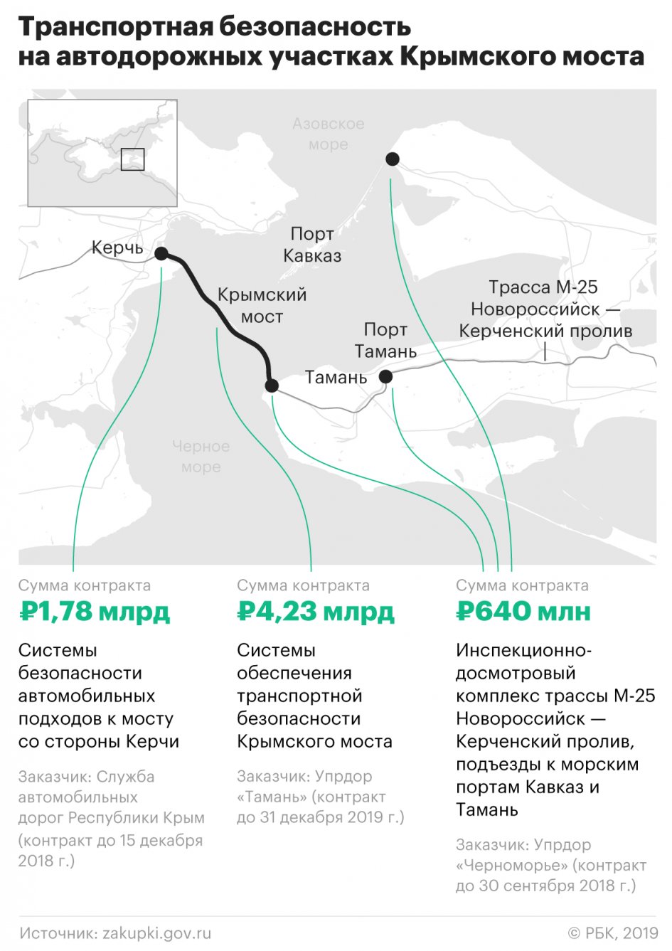 Заказчиками работ по обеспечению транспортной безопасности моста и сопутствующих участков выступали Служба автомобильных дорог Крыма, структуры Росавтодора (управления «Черноморье» и «Тамань») и Росжелдор. Общая стоимость подрядов — 12 млрд руб. Генподрядчиком строительства моста выступает «Стройгазмонтаж» Аркадия Ротенберга, стоимость проекта составила 228,3 млрд руб.