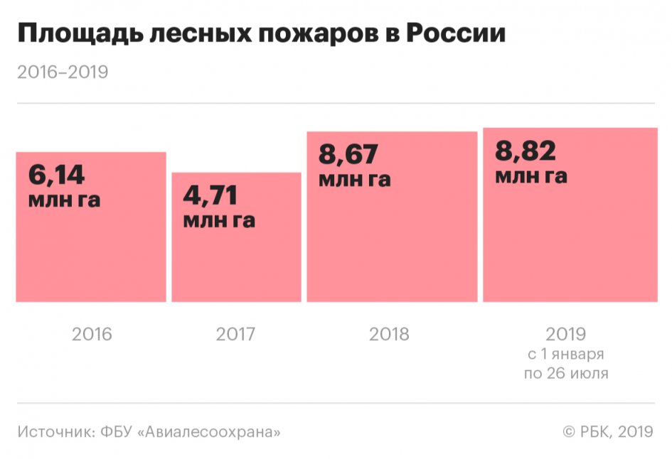 При этом с начала 2019 года до конца июля общая площадь всех зафиксированных лесных пожаров (и не все эти леса являются уничтоженными) составляет 8,82 млн га. Этот результат не слишком сильно отличается от аналогичного периода прошлого года — за семь месяцев 2018-го огнем было затронуто 8,4 млн га (за весь прошлый год — 8,67 млн га).