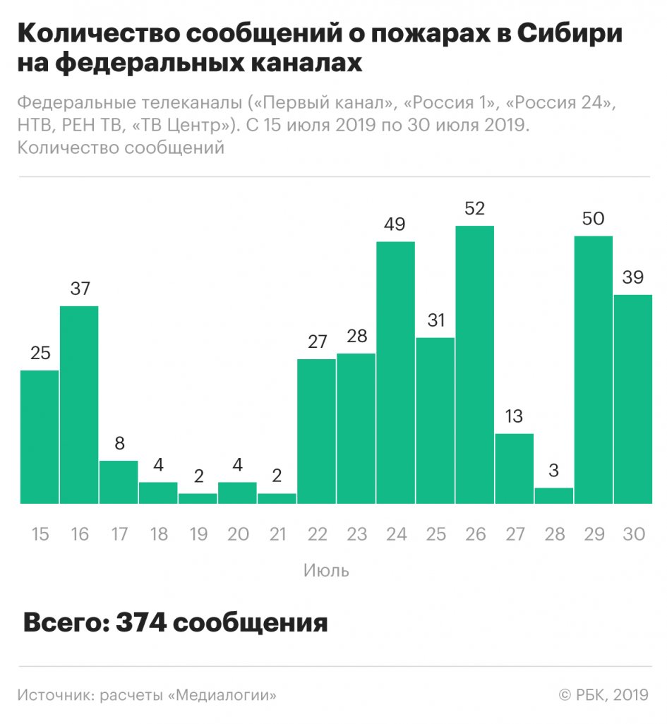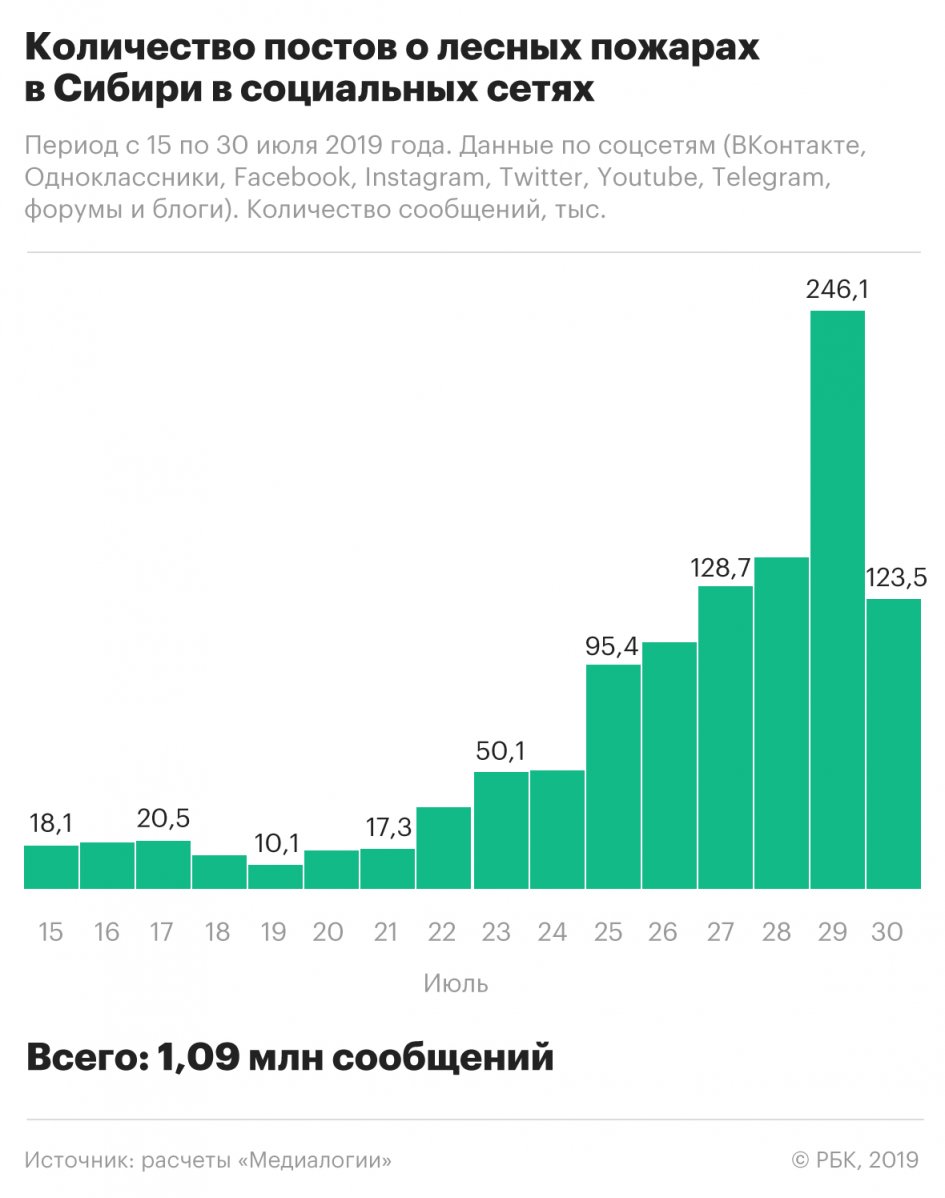 Согласно данным «Медиалогии», которая по просьбе РБК проанализировала пользовательскую активность по теме «лесные пожары в Сибири» в популярных соцсетях и блогах за последние две недели, резкий — почти двукратный — рост активности пришелся на конец прошлой недели — 24–25 июля, накануне несогласованной акции в поддержку оппозиционных кандидатов в Москве: тогда количество сообщений увеличилось с 50,5 тыс. до 95,4 тыс. в сутки. 24 июля зафиксировано и резкое увеличение числа сюжетов о пожарах на федеральных каналах.
