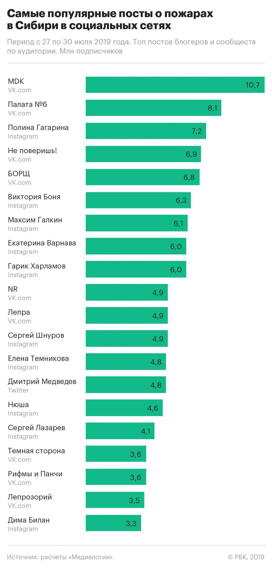 Необычно популярными посты о пожарах становились и у обычных пользователей. Например, пост о пожарах с популярными хештегами у производителя экошуб «Меховица» набрал почти 6 тыс. лайков, при этом обычные посты собирали в среднем по 100–200. Аналогичное сообщение про пожары у пользователя под ником fufonchik (ее посты собирают обычно по 10–20 лайков) набрало более 10,5 тыс.