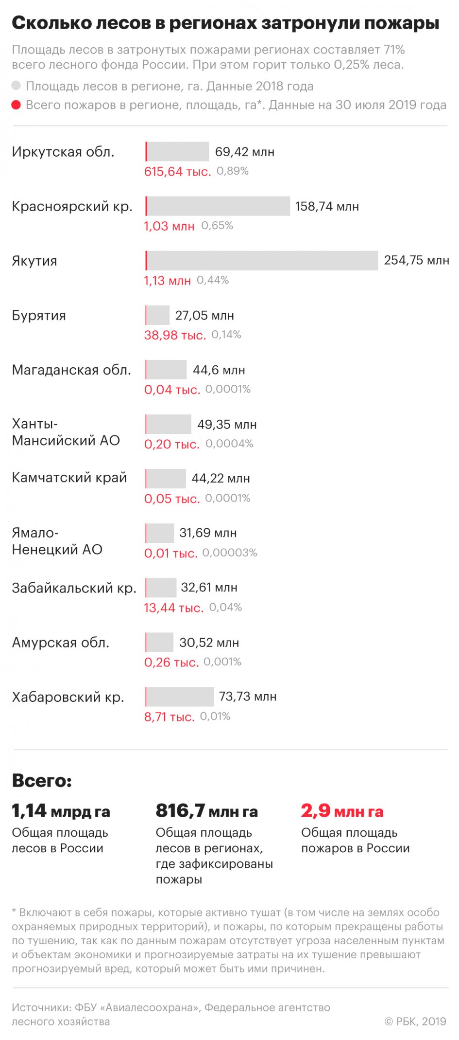 Если сопоставить данные о текущей площади возгорания (использовались данные на 30 июля) с официальными данными об объеме лесов, то ни в одном из российских регионов этот показатель не превысит 1%.