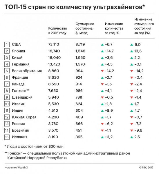 Абсолютным лидером по числу долларовых мультимиллионеров и миллиардеров в 2016 году стали США. Количество сверхбогатых американцев увеличилось за отчетный период на 6,7%, до 73 110 человек, а их совокупное состояние — на 6%, до $8,7 трлн. Второе место по количеству богачей занимает Япония: за прошедший год этот показатель в стране увеличился на 14,7%, до 16 740 человек. Суммарные активы японских ультрахайнетов также выросли — на 13,8%, до $1,5 трлн. Замыкает тройку лидеров Китай, где число сверхбогатых граждан показало рост на 3,6%, до 16 040 человек, а объем их благосостояния — на 2,2%, до $1,9 трлн. Россия в этом рейтинге заняла лишь 13-е место, уступив в том числе таким странам, как Южная Корея, Индия и Италия.