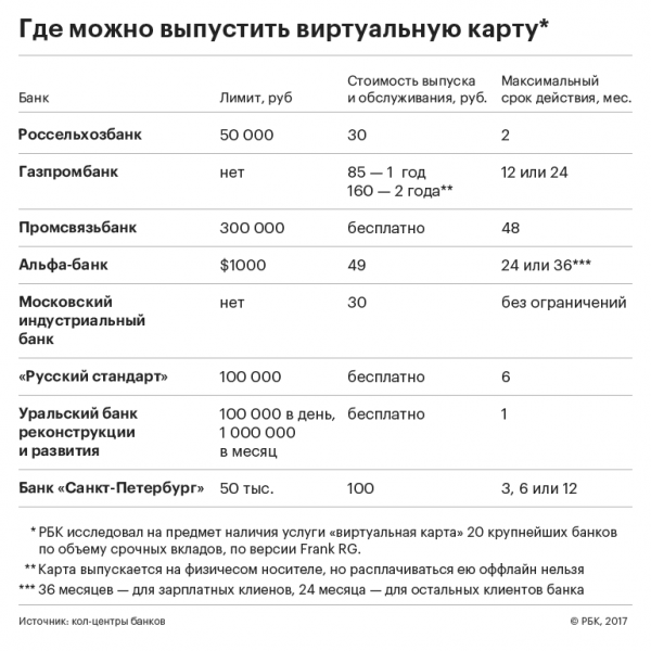 Чаще всего по виртуальной карте предусматривается лимит. Например, в Россельхозбанке и банке «Санкт-Петербург» он составляет 50 тыс. руб., в Промсвязьбанке — 300 тыс. руб., в Уральском банке реконструкции и развития — 1 млн руб. (но не более 100 тыс. в день). В Газпромбанке и Московском индустриальном банке лимиты не предусмотрены.