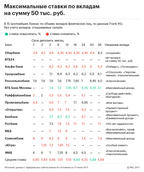 Кроме того, на динамику средних ставок в июне могло повлиять снижение доходности по депозитам в самом крупном банке страны — Сбербанке, считает генеральный директор Frank Research Group Юрий Грибанов. С первого июня банк снизил ставки по вкладам в рублях на 0,1–0,5 п.п. «Сбербанк — это маркетмейкер, и для рынка изменение его ставок — это даже более важный сигнал, чем изменение ключевой ставки», — рассказывает эксперт.
