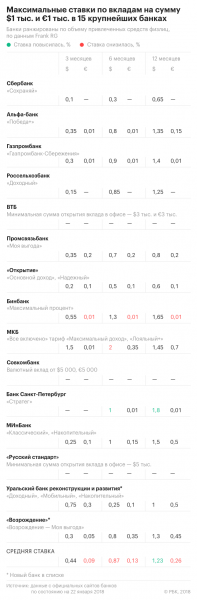 В исследовании РБК рассчитывается доходность вкладов на сумму $1 тыс. и €1 тыс. для валютных депозитов на три, шесть и 12 месяцев. В марте в выборку вошли два новых банка — Уральский банк реконструкции и развития и банк «Возрождение». Ушли из топ-15 Росбанк и СМП Банк (топ-15 банков по объему вкладов отражает ситуацию на 1 февраля 2018 года).